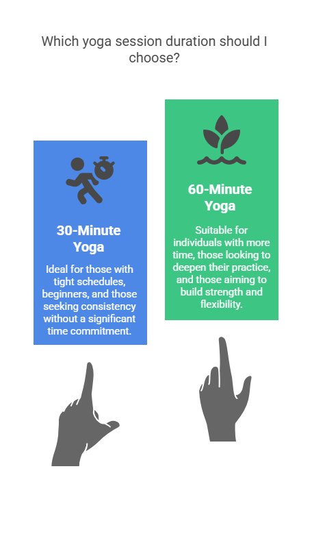 Your choice between 30-Minute Yoga and 60-Minute Sessions depends on your personal goals and lifestyle: