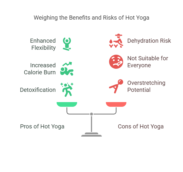 Yes, potential risks of Hot Yoga include dehydration, heat exhaustion, and heatstroke, especially if proper hydration and precautions are not observed. Individuals with cardiovascular issues, pregnant women, or those sensitive to heat should consult a healthcare professional before participating. ([health.clevelandclinic.org](https://health.clevelandclinic.org/is-hot-yoga-right-for-me?utm_source=openai))