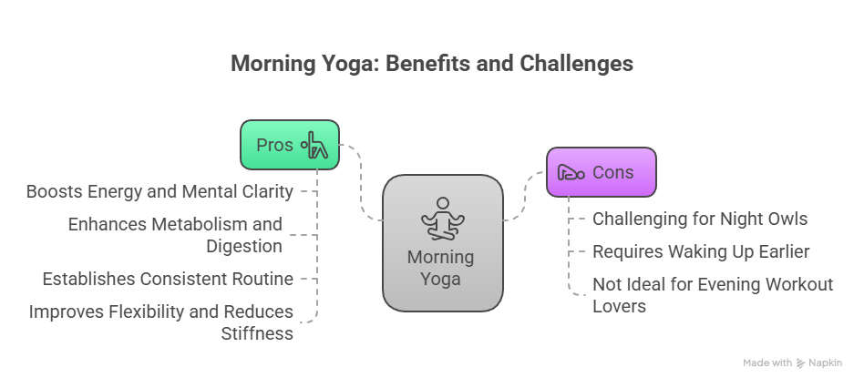 Morning yoga helps release early stiffness and prepares the body for the day’s activities, reducing the risk of injury.