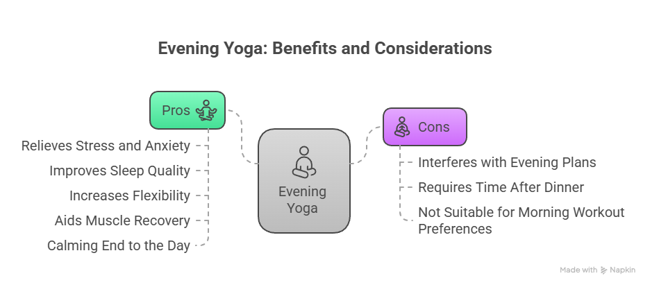 Evening yoga aids in muscle recovery, reduces soreness, and increases flexibility after daily activities, making it ideal for those with physically demanding days.