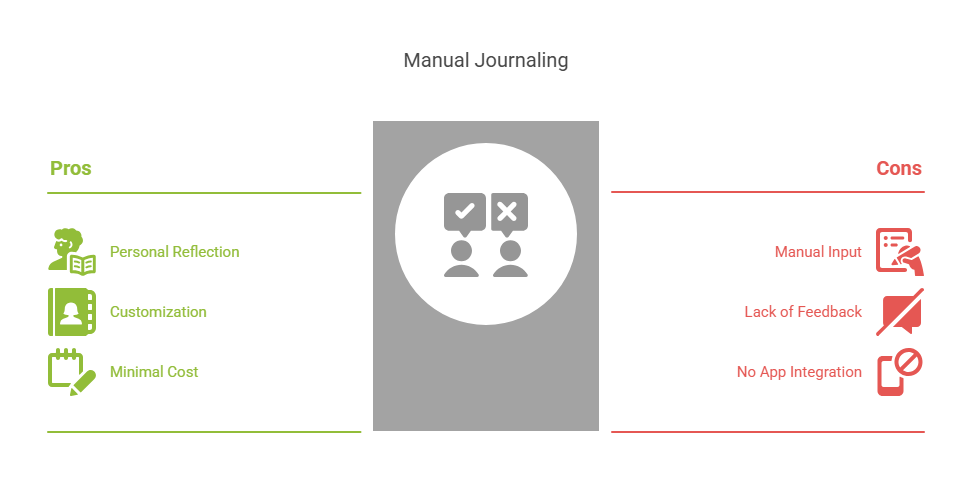 – **Manual Journaling**: Offers delayed insights based on personal reflections and self-assessment, promoting mindfulness and self-awareness over time.